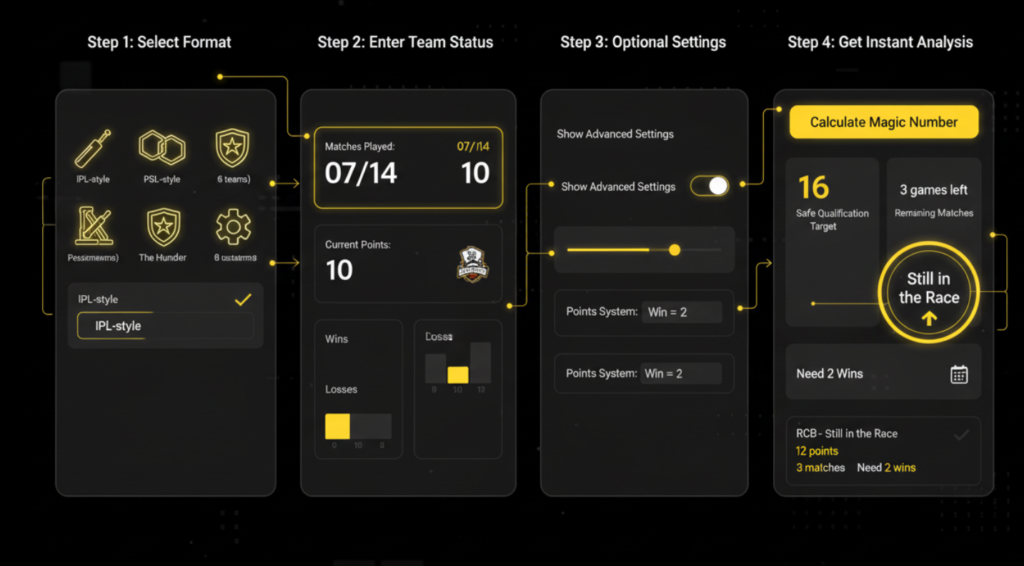 For instance, in a standard IPL season, teams typically need 16-18 points to safely qualify. But if you’ve played 12 matches with only 10 points and have 2 remaining, can you still make it? The Magic Number Calculator answers instantly with three outcomes: Likely Qualified, Still in the Race, or Mathematically Eliminated.